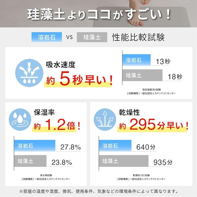 【バスマットの常識を覆す!溶岩石の驚異的な吸水・速乾パワー】 溶岩石はマグマが急激に冷えて固まった際に無数の「孔(あな)」が生成される多孔質構造が特徴。この大小様々な孔が、水分を瞬時に吸収し、速やかに放出するメカニズムを生み出します。 ⇒吸水速度:珪藻土18秒と比較し、約5秒速い! ⇒乾燥性:珪藻土より約295分速い! ⇒消臭・防カビ・調湿効果: 溶岩石が持つ天然の力が、気になるニオイやカビの発生を抑えます。 ※使用環境(温度・湿度・換気・気象など)によって異なります。