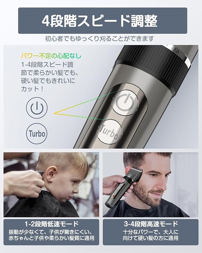 【3段階速度調整&低騒音】バリカンは1-3段階散髪スピードを調整でき、子供または幼児の柔らかい髪でも、大人の硬い髪でもラクラクカット。バリカンの扱いに慣れてない初心者でも、焦らずヘアカットができます。振動を軽減する低騒音設計で時間帯を気にせず刈り上げ可能だから場所を選ばない。お子様が驚くことがなく、じっとしているのが苦手な子供の髪もしっかりとカットできます。