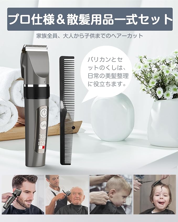 【LCDディスプレイ&USB充電】バリカンにはLED液晶ディスプレイが搭載されており、ひと目で充電の残量、速度レベルをでき、残量を気にしながらカットする必要がありません。約1時間の急速充電で約180分使用できる大容量バッテリー内蔵、忙しい人にもぴったり。USB充電式でコードレスで使いやすく、コンセント不要でどんな場所でも楽々ヘアカット!子供・家庭・業務・出張用などの場合に適用します。