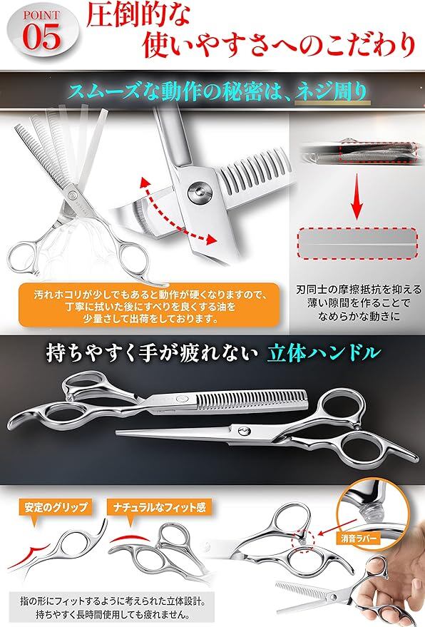 【失敗しにくい低スキ率15%採用】一般的なスキ率20%~30%以上のすきばさみでは、切りすぎて失敗しやすくなってしまいます。そこで当店のすきばさみは失敗しにくい15%という低スキ率を採用。スキ率を抑えることによって、少量ずつ毛量を調整し“スキすぎる”ことなくカットができます。初心者の方でも失敗するリスクをおさえ、安心してセルフカットができます。