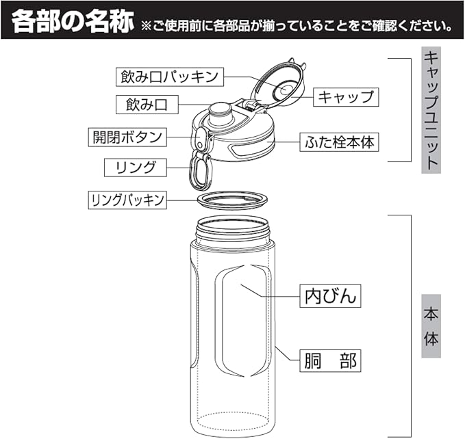 品名:ステンレス製携帯用まほうびん、実容量:1.0L、保冷効力:10度以下(6時間)、素材・材質:内びん/ステンレス鋼、胴部/ステンレス鋼(ポリエステル粉体塗装)、ふた栓・キャップ/ポリプロピレン(耐熱温度100度・耐冷温度-20度)、開閉ボタン・リング/ABS樹脂(耐熱温度80度・耐冷温度-20度)、パッキン/シリコーンゴム(耐熱温度180度・耐冷温度-20度)
