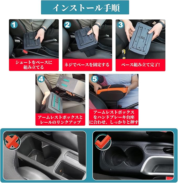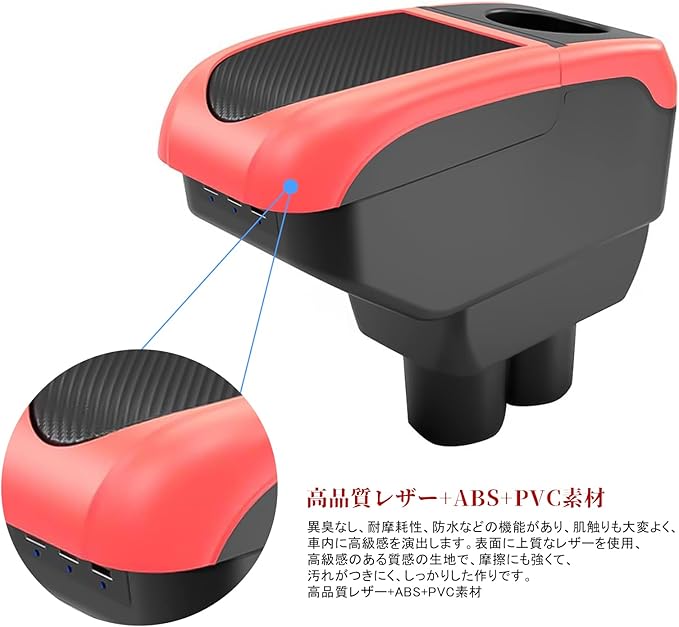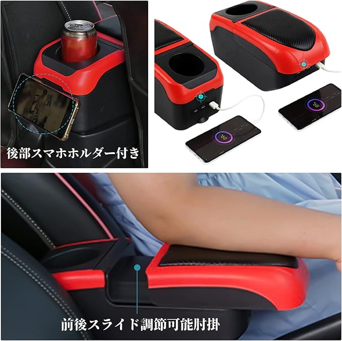 【改良型特徴】前後スライド式調節可能設計、座席の肘掛のい長さが足りない時、肘掛をスライドすればいいです。多機能アームレスト、運転疲労軽減が顕著、肘置き、90度近くまで角度調整出来、ドリンクホルダー増設、取付簡単、小物関係の内蔵の収納スペース、シートベルト、シフトやシガーライターに干渉しません、耐久、ワンタッチで開き、高級感溢れてきます。