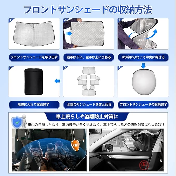 4.【車内内装・プライバシー保護・盗難防止】紫外線防止・室内劣化・冷房防止。UVカットの特殊生地で太陽光の熱エネルギーのスペクトルを反射して99%の有害な紫外線を効果的に遮断し、駐車時の日光から車を守り、ハンドルやけやシートなどの内装の日焼けを抑えて愛車を守ります。6層の断熱材を使用することで、車内の温度を下げ、空調負荷を減らし、燃費を向上させることができます。車上荒らしから大切な愛車を守る鉄則、それは外からの視線を遮ることです。物色されないので盗難防止効果があります。ドライブとアウトドアが好きな方にオススメ、ぜひ体験してみてください。