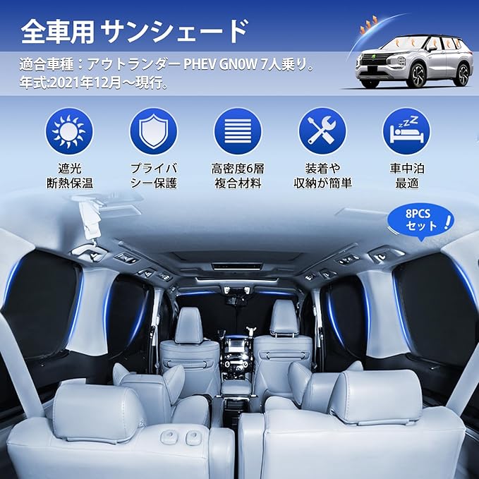 CARVANTA アウトランダー PHEV GN0W 7人乗り サンシェード 遮光シェード 全車窓用 フロントサンシェード 2021年12月~現行 フルセット マルチサンシェード プライバシー 暑さ対策 仮眠 断熱 遮光 高密度 紫外線カット UVカット 盗難防止 車中泊 アウトドア 全窓対応 簡単着脱 取付簡単 6層構造 収納袋付き 8PCS