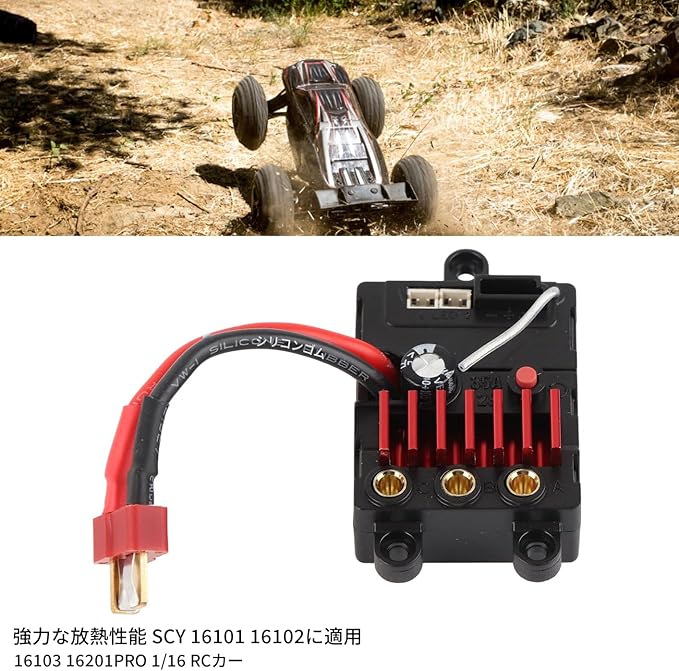【商品仕様】材質:プラスチック、電子部品;重量:32.00g;動作電圧:7.4V;連続電流:35A;バッテリータイプ:2S Lipo;製品サイズ:約1.8cm/1.13オンス42.5x33x19mm / 1.7x1.3x0.7インチ(ワイヤーを除く);対応機種:SCY 16101、16102、16103、16201PRO 1/16 RCカー;パッケージ内容:35AブラシレスESC x 1