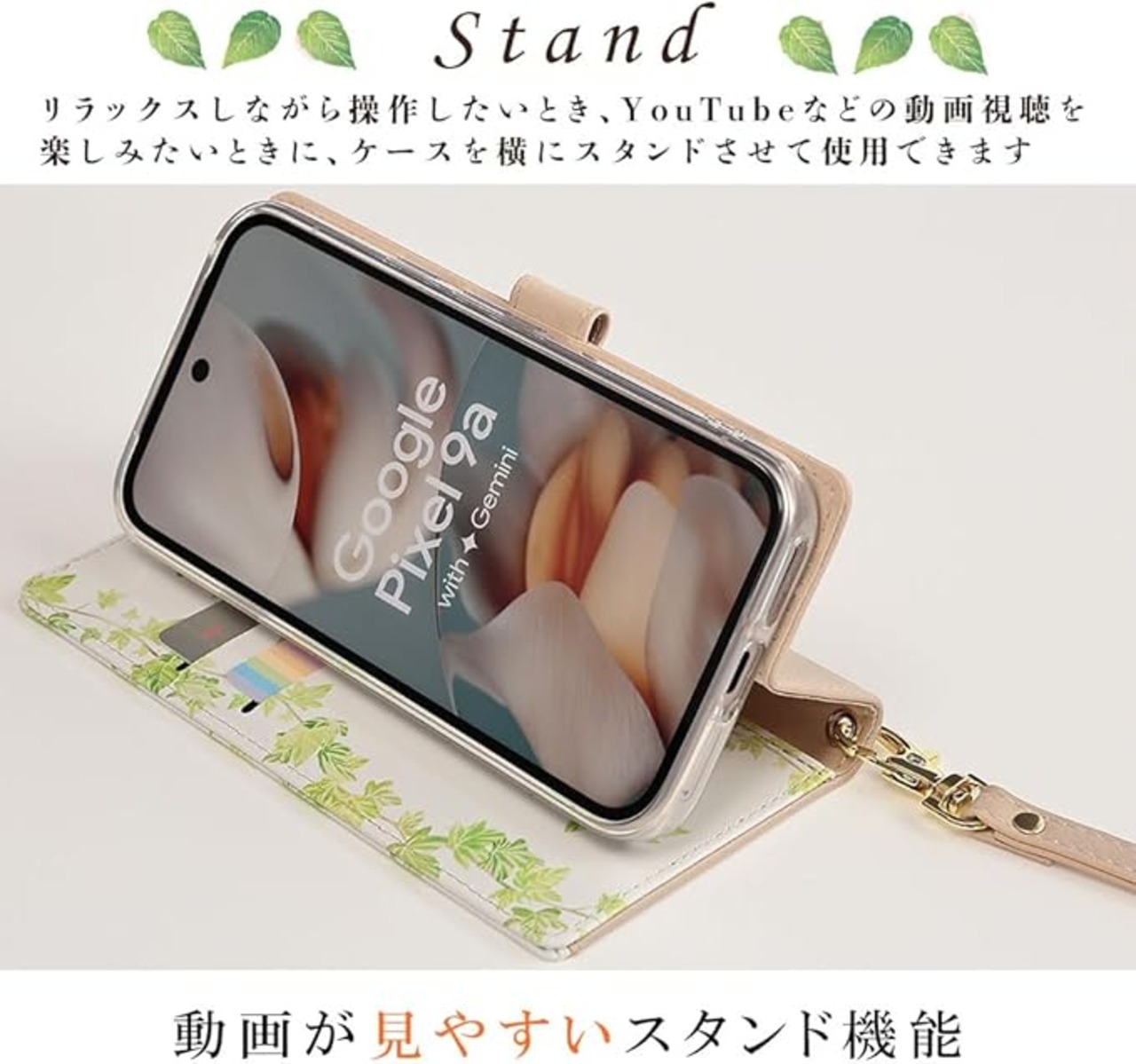 植物の葉っぱデザインがおしゃれな手帳型ケース。