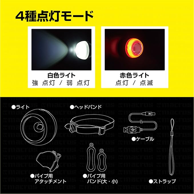切替モードは4種点灯モード(白色強点灯、弱点灯、赤色点灯、点滅)で使い分けできる。
