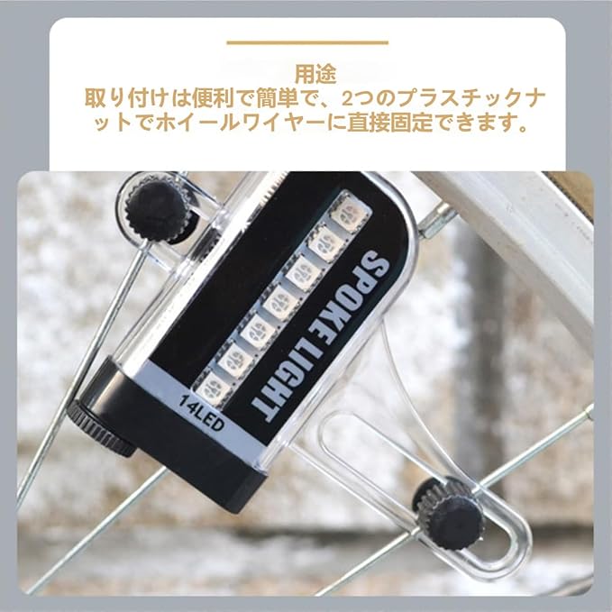 明るく安全 - 14 個のカラフルな RGB LED ライトで作られています。各 LED は 8 色で点滅し、夜間には非常に明るくなります。30 種類のパターンを点滅させることができ、各パターンは 4 秒ごとに変わります。ほぼすべての自転車に取り付けられ、どこからでも見えます。