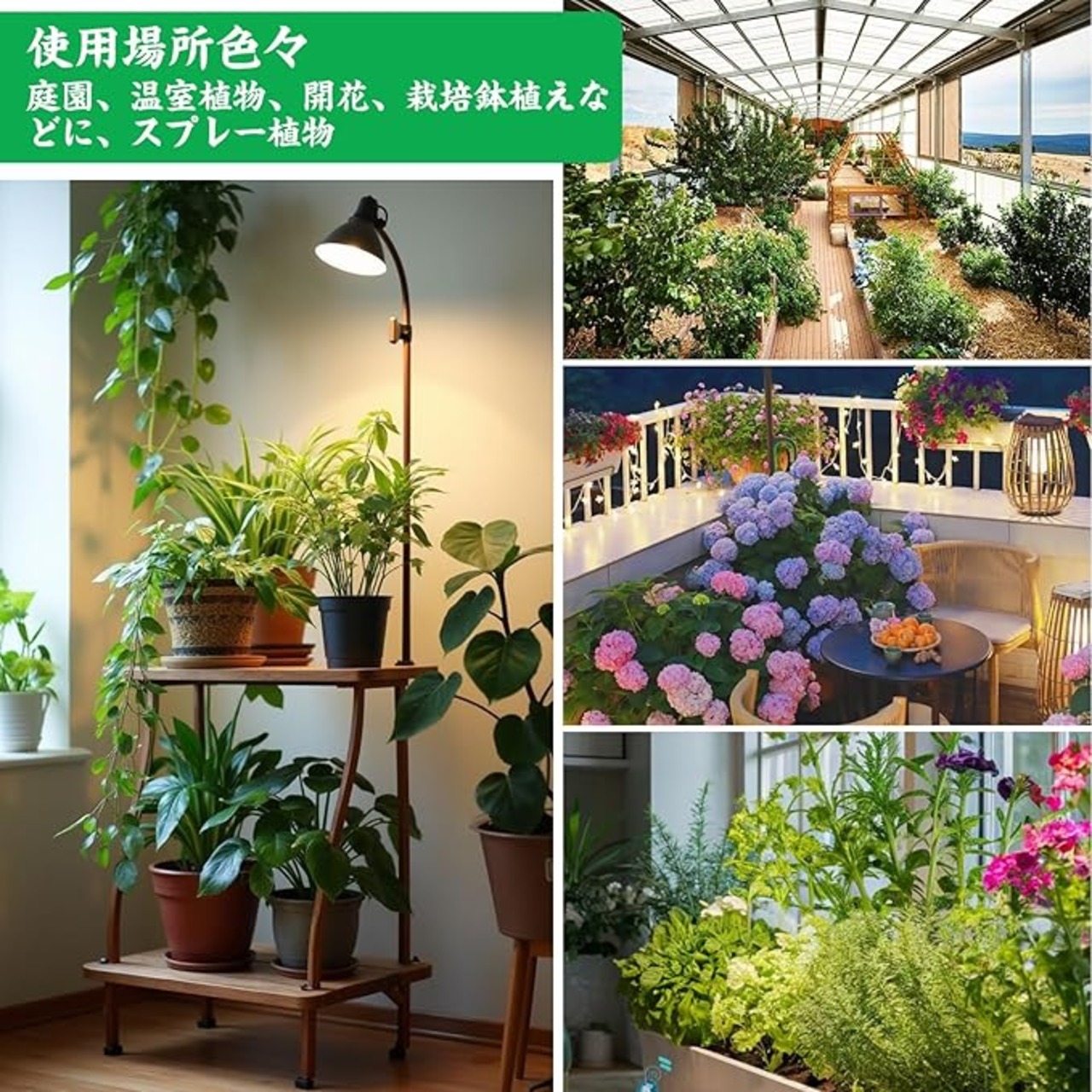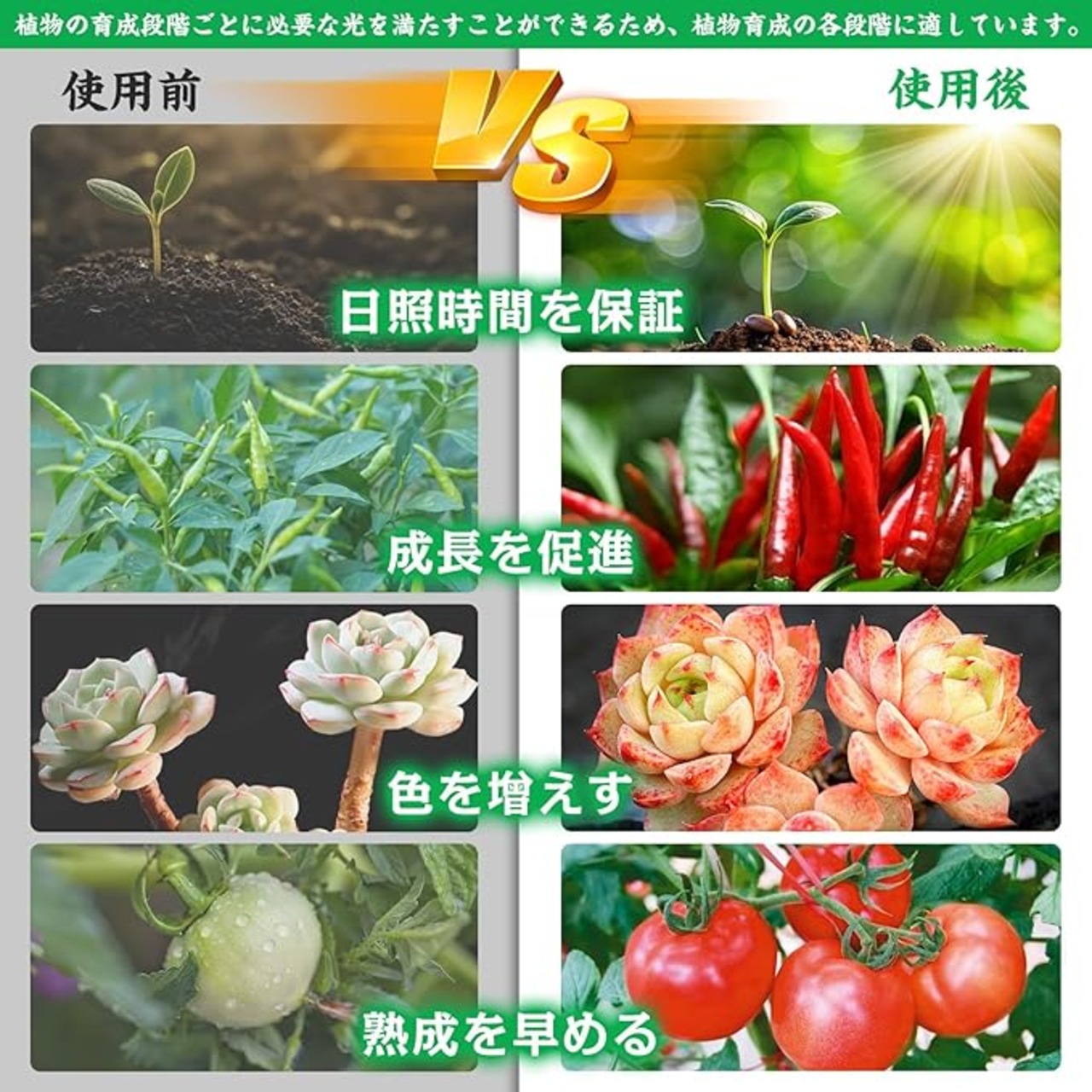 【フルスペクトル照明】: フルスペクトル、太陽光に近い、波長範囲は 380nm から 800nm です。悪天候や暗い部屋などで植物が十分な光を必要とする場合、播種、発芽、栄養、開花に必要な光を与えます。