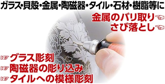 金属のバリ取り、さび落とし、グラス彫刻、陶磁器の彫り込み、タイルへの模様彫刻