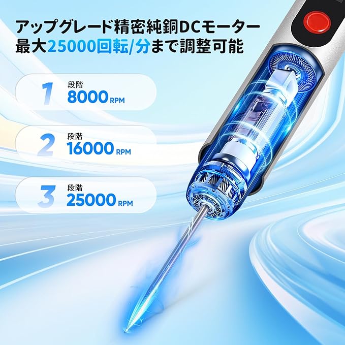 【3段変速可能】彫刻ペンは回転速度が3段階調整できます。作業内容や材料によって、最適な回転数で彫刻/穴あけ/研磨/切断/切削/汚れ落としなどの様々な作業が安心的に完成できます。握りやすいペン式で、初心者にも恐れなく利用できます。20000RPMまで高速回転もでき、ガラス彫刻や金属研磨・穴あけ・つや出し・模型工作などに対応できます。