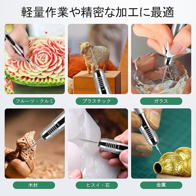 【3段変速可能】電動彫刻ペンは回転速度が3段階調整できます。作業内容や材料によって、最適な回転数で彫刻/穴あけ/研磨/切断/切削/汚れ落としなどの様々な作業が安心的に完成できます。握りやすいミニサイズで、初心者にも恐れなく利用できます。20000RPMまで高速回転もでき、ガラス彫刻や金属研磨・穴あけ・つや出し・模型工作などに対応できます。