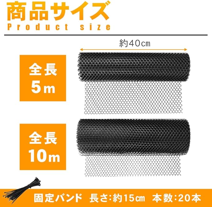 【セット内容】脱走防止フェンス 1巻 固定バンド 20本 【サイズ(約)】幅:40cm 長さ:5m・10m ※お好きな長さをお選びいただけます。【カラー】ブラック 【材質】プラスチック
