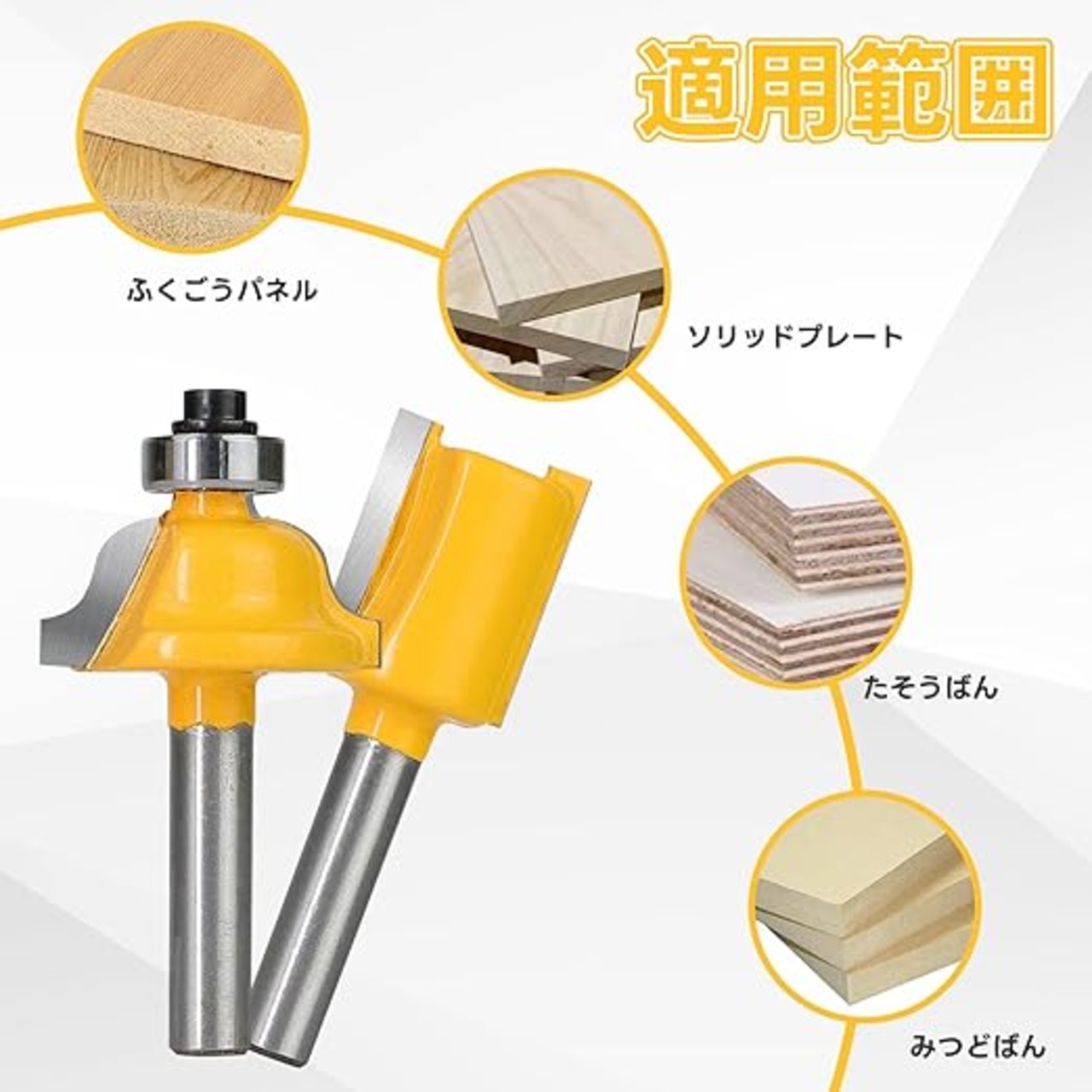 多素材対応 & ご使用上の注意。無垢材、MDF、合板、アクリルなど、様々な木材の加工に最適です。 ※鋼、鉄などの金属や研磨材の加工には使用しないでください。 ※あらかじめご了承ください:シャンク径は機械への取り付けを容易にするため5.95mm 0.02に設計されています。また、表面の塗装が使用時に剥げることがありますが、性能に問題はありません