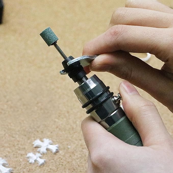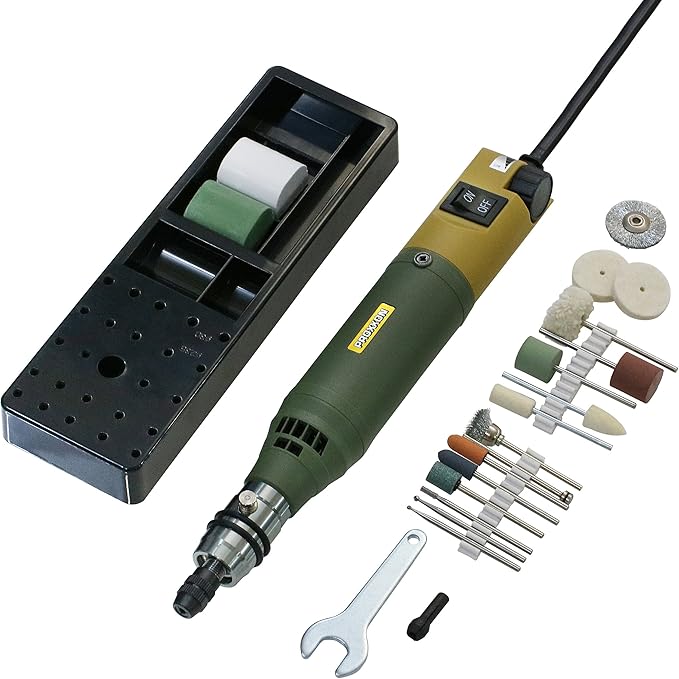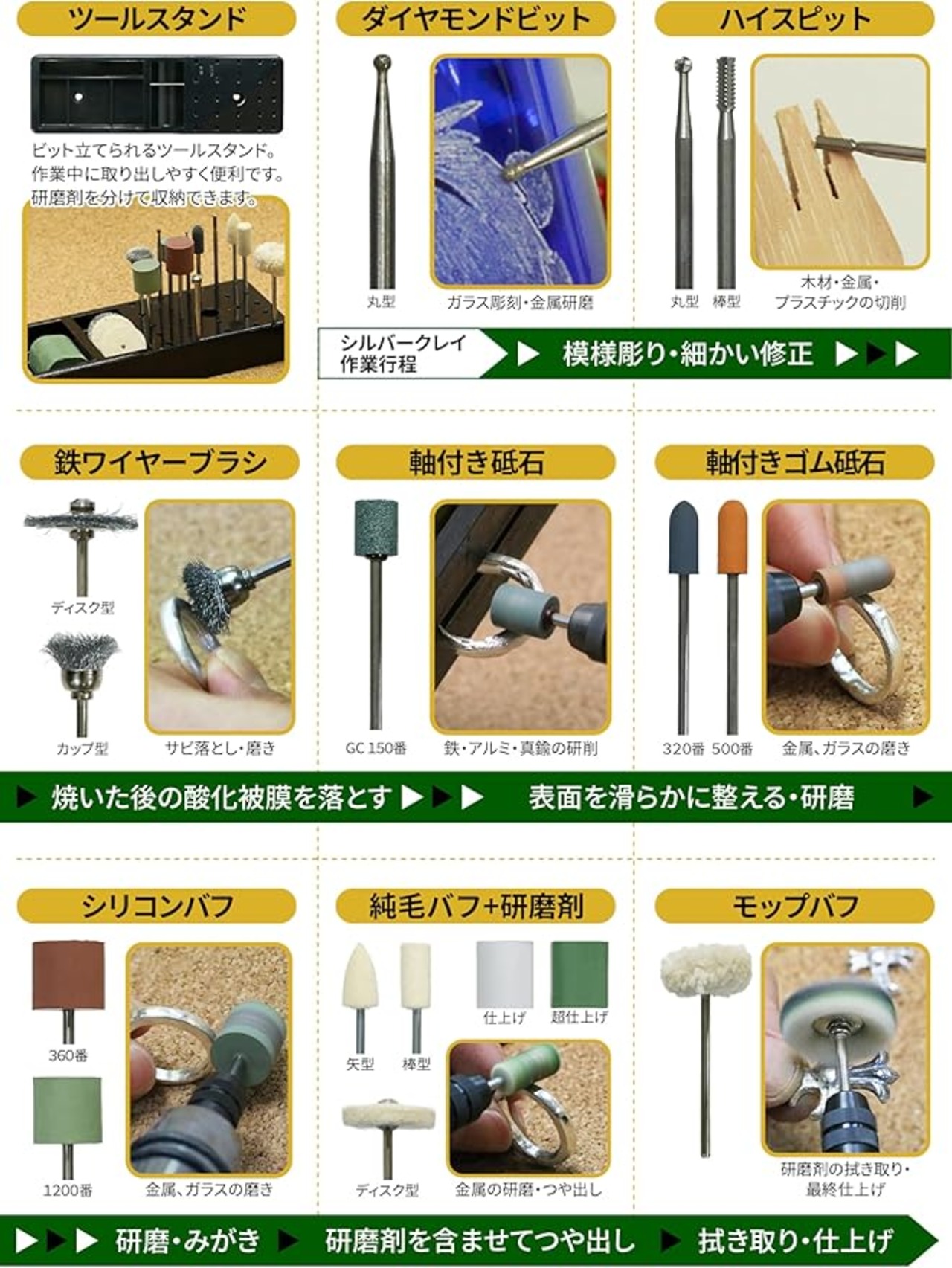 付属品:ダイヤモンドビット1本、ハイスビット2種、軸付き砥石(GC)1本、ゴム砥石2種(青320番、オレンジ500番)、ワイヤーブラシ(鉄カップ型)1本、ワイヤーブラシ(鉄ディスク型)1本、シリコンバフ2種(茶360番、緑1200番)、純毛バフ3種、モップバフ1本、研磨剤2種、専用シャフト1本、コレットチャック2種(直径2.35/3.0mm用)、ツールスタンド1個、スパナ1本