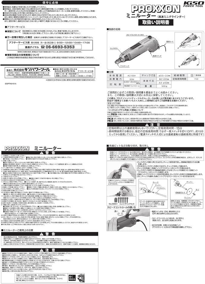 付属品:ドリル(ハイス)10種・ワイヤーブラシ(ディスク)・切断砥石 5・純毛(バフディスク) 2・彫金用バフ・純毛バフ(棒)・純毛バフ(矢型)・軸付砥石(WA)筒型/矢型・フラップホイールペーパー120番(径20mm)・ハイスビット丸/棒・専用シャフト 2・専用ビットケース