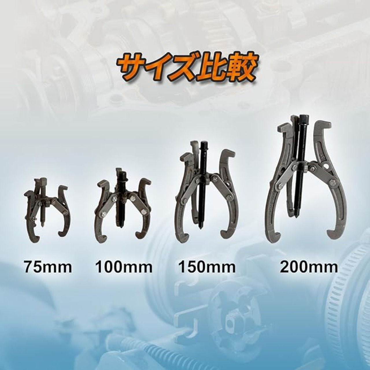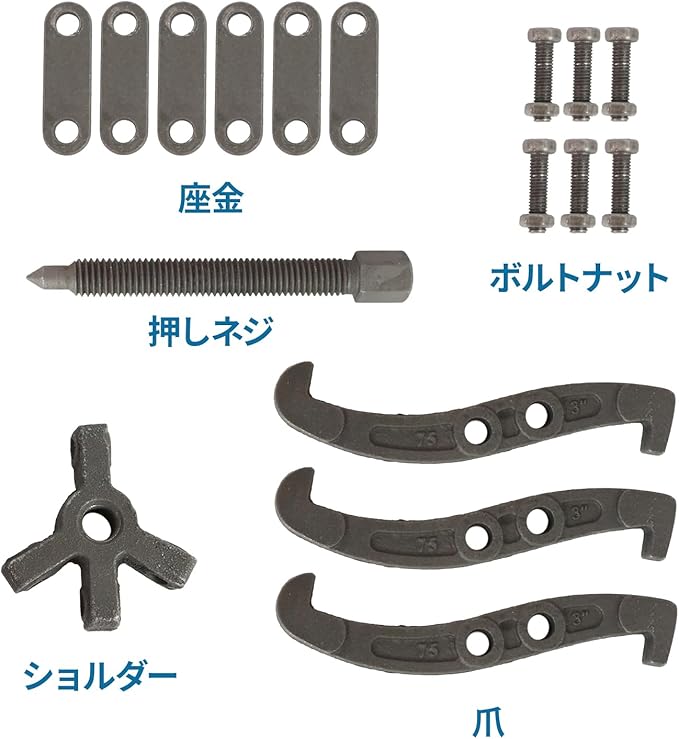 ギアプーラー(ベアリングプーラー) 3本爪 75mmは、プーリやギアなどの部品を、効率的に引き抜くために設計された専用工具です。直径75mmの3本の爪を利用することで、対象の部品を確実に保持し、安定した引き抜き作業を実現します。