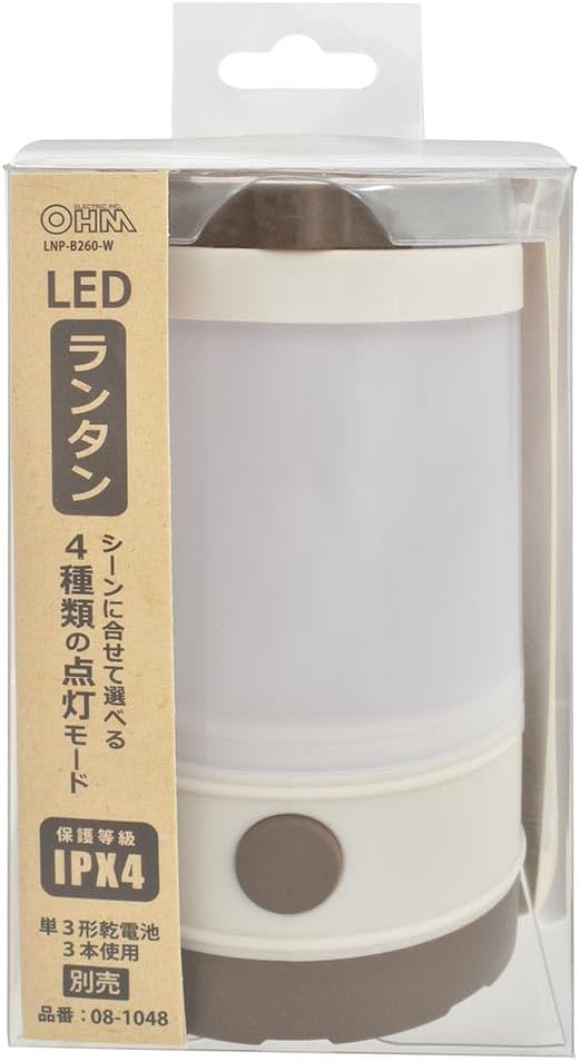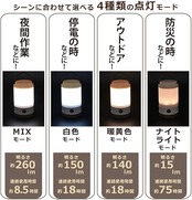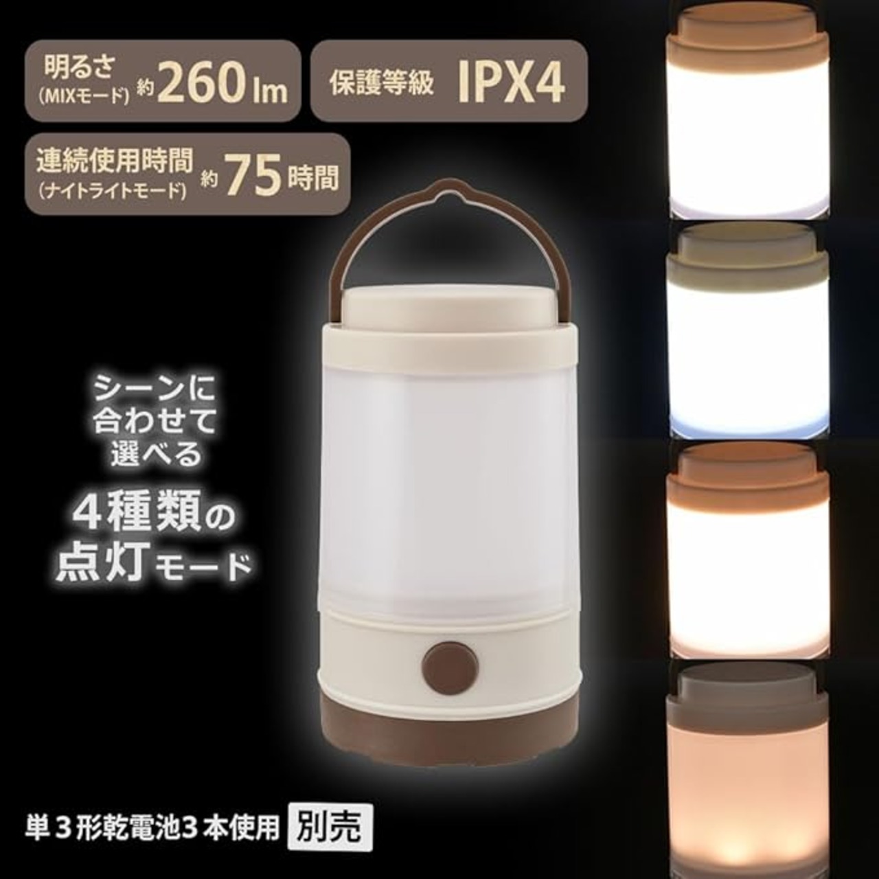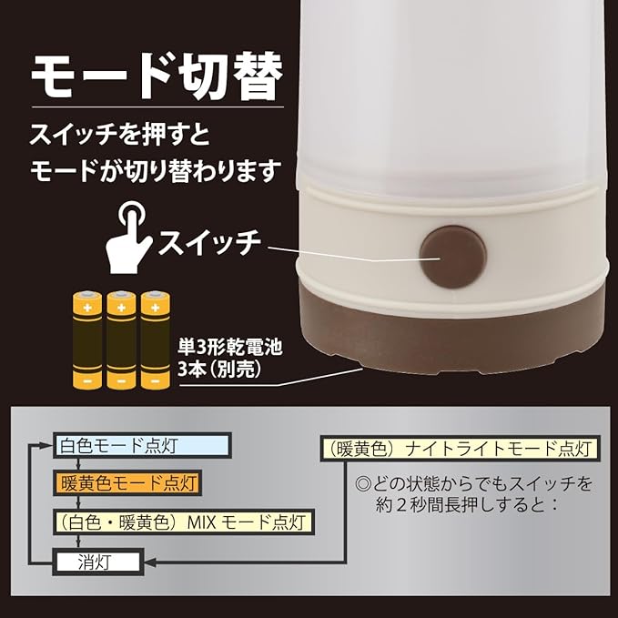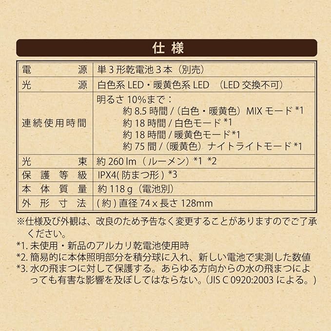 【 特 長 】 ◆シーンに合せて選べる4種類の点灯モード・ ナイトライトモード(暖黄色)・ 暖黄色モード・ 白色モード・ MIXモード(白色・暖黄色) ◆明るさ 約260ルーメン(MIXモード) ◆連続使用時間 約75時間(ナイトライトモード) ◆保護等級 IPX4 ◆単3形乾電池3本使用(別売)