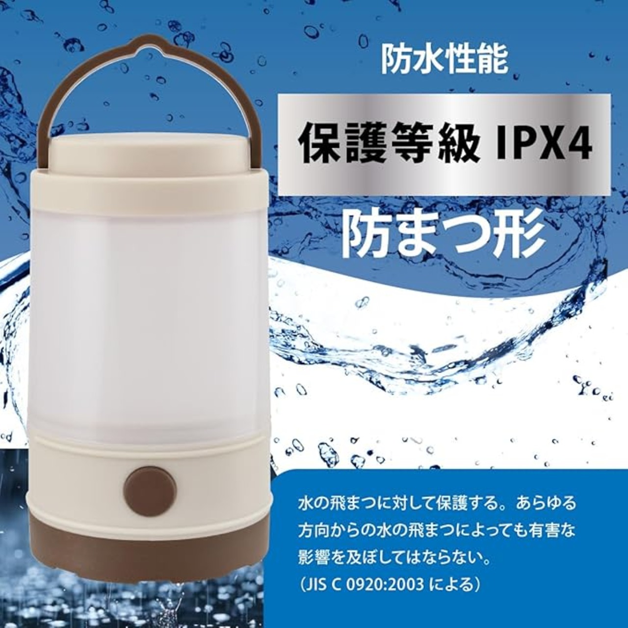 ■ 保護等級:IPX4(防まつ形)…水の飛まつに対して保護する。あらゆる方向からの水の飛まつによっても有害な影響を及ぼしてはならない。(JIS C 0920:2003による)