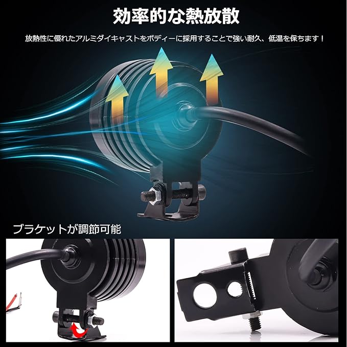 ✔【素材からこだわったランプボディ】ボディは高い質感を持つアルミダイキャスト製。固定用ブラケットとボルト・ナットは強度強いスチール製。固定用ステーは振動に強いゆるみ防止仕様で、そして角度が調節可能なタイプです。手に取っていただければ、品質の高さを感じていただける仕上がりとなっております。