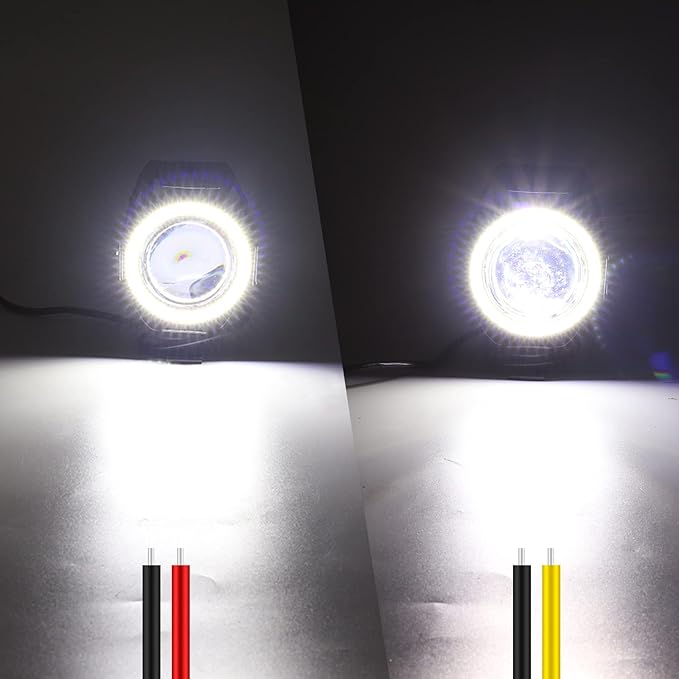 【スイッチひとつで2つの発光パターン入れ替えられ】3本の電線が伸びていますが、黒がマイナス線です。①プラス:赤線 → レンズからホワイトライトとリングからホワイトライト同時に点灯する ②プラス:黄線 → リングからホワイトライト さらに、六角スパナ付いて簡単にインストールできます。