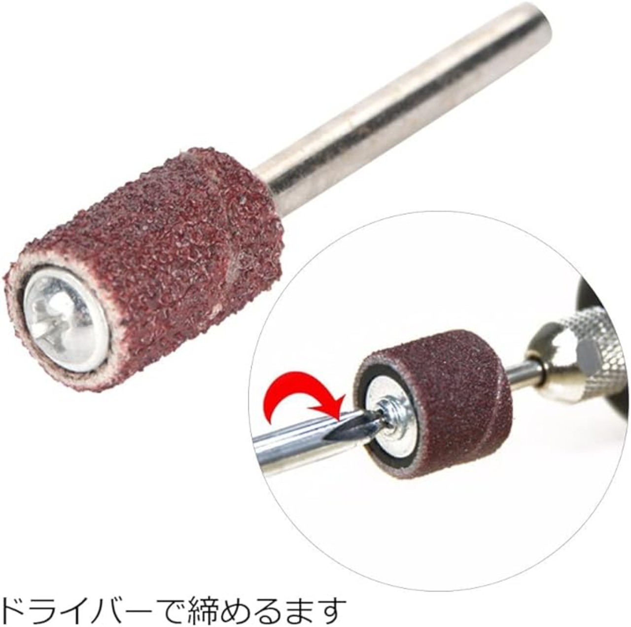 【使用方法】サンディングドラムとバングの位置を合わせます、ドラムにバンドを被せる、プラスドライバーを使用して、ドラムのネジをひねります。【ご注意】ドラムマンドレルは自己膨張性ゴムクッション付き、使用前にドラムがしっかりとねじ込まれてスリーブに密着していることを確認してください。