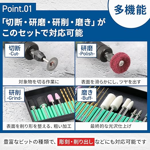 【切る・削る・磨くが全部できる!】このビットセットひとつで、切断・研磨・研削・バフが思いのまま。硬い素材も柔らかい素材も、思いどおりに加工できるからDIYの可能性が無限に広がります。ビットの種類は51種、内容量は驚きの303個!工作・ホビー・補修など、あらゆるシーンで活躍します。