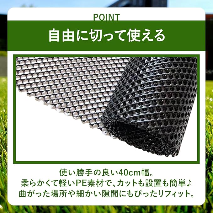 【自由に切って使える】使い勝手の良い40cm幅。柔らかくて軽いPE素材で、カットも設置も簡単♪曲がった場所や細かい隙間にもぴったりフィットします。0.8cmの細かい網目で、動物が手足を掛けられない設計です。