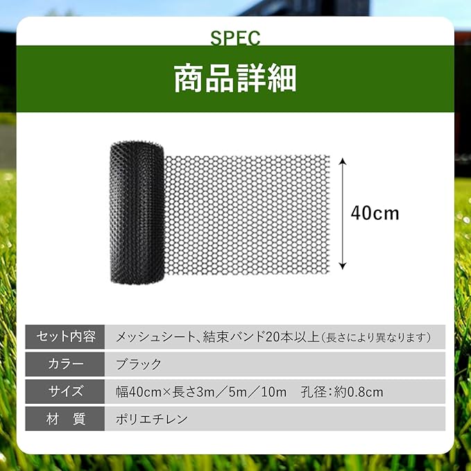 【商品詳細】セット内容:メッシュシート、結束バンド20本以上(長さにより異なります) カラー:ブラック サイズ:幅40cm 長さ3m/5m/10m 孔径:約0.8cm 材質:ポリエチレン