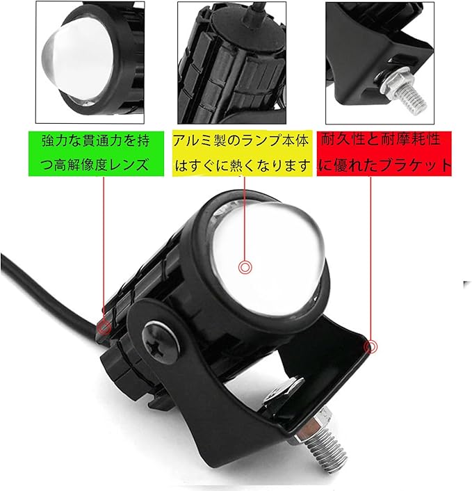 峠やカーブ、降雪、濃霧…視界が悪い状況下で路面を広く照らし効率良く視界を確保するために重要なフォグランプ。視認性アップでより快適なツーリングを♪製品を所定の位置に締め付け、正負極電線を正しく接続するだけで設置が完了。ステーは上下に角度調整が可能です。特殊な放熱設計のアルミダイカストシェルを採用し、放熱面積を大幅に増やし、放熱効果が高く、使用寿命を延ばします。 製品の詳細: