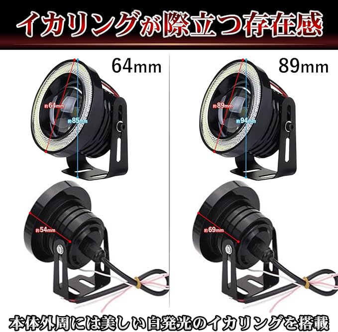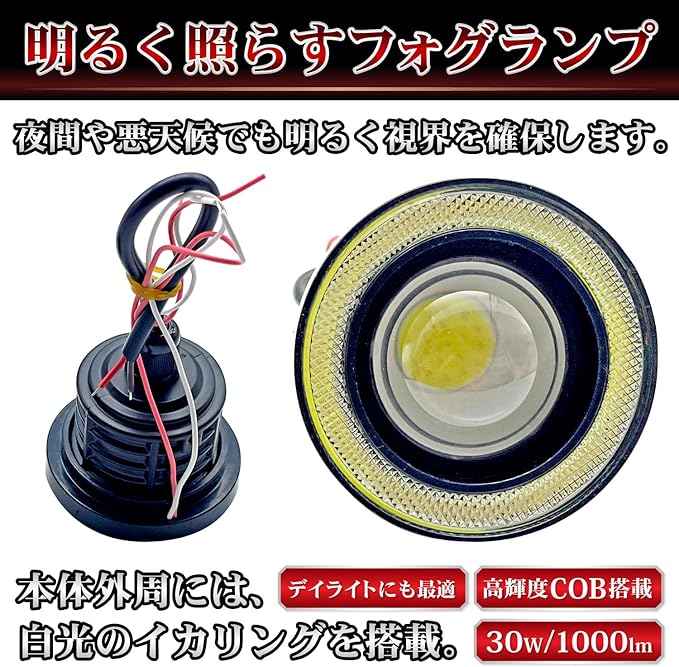 【1. 高輝度COB搭載|明るく照らすフォグランプ】COBチップを採用した30WのLEDフォグランプは、1200lm,白色光(約6000~7000K)を放ち、夜間や悪天候でも明るく視界を確保します。【2. イカリングが際立つ存在感|デイライトにも最適】本体外周には美しいホワイト発光のイカリングを搭載。デイライトやウインカーとしても活用でき、ヘッド ライトと並ぶ視認性とドレスアップ効果を両立します。昼夜問わず視界と存在感を高めるだけでなく、愛車をスタイリッシュに演出できるled イカリング ライトとしてもおすすめです。【3. コンパクト車両に最適な64mmサイズ】本商品は2.5インチ(約64mm)の小型設計。軽自動車・オートバイ・スクーター・小型車など、取り付けスペースが限られた車両にもスマートにフィットします。小ぶりながらもCOBチップ搭載の30W出力・1000lmの明るさで、夜間や悪天候時にも安心の視界を確保。led フォグ ランプ イカリング ヘッド ライト 64 mmとして、さりげないドレスアップにも最適です。左右セット(2個入り)、12V車のカスタムにもぴったりな汎用アイテムです。【4. 高耐久ボディ&省エネ設計】本体は耐熱性と放熱性に優れたアルミヒートシンク構造で、熱による劣化を軽減。さらに高輝度COB LEDにより、明るさと省電力を両立しています。コンパクトながら実用性に優れ、ドレスアップだけでなく実用フォグとしても活躍します。愛車に合わせたカスタムが楽しめるled ヘッド ライト パーツとして注目されています。【5. ご購入前のご案内と注意事項】・本製品は輸入品のため、使用に支障のない程度の箱の潰れや傷や擦れがある場合がございます。あらかじめご了承ください。 ・取扱説明書は付属しておりません。また、取り付けに関するサポートは行っておりません。取り付けに不安のある方は、専門業者へご相談ください。 ・ご使用方法や取り付けによって発生したトラブル・事故等に関しては、一切の責任を負いかねます。お客様ご自身の責任においてご使用ください。 ・完全防水ではないため、必要に応じて追加の防水処理を施すことを推奨いたします。