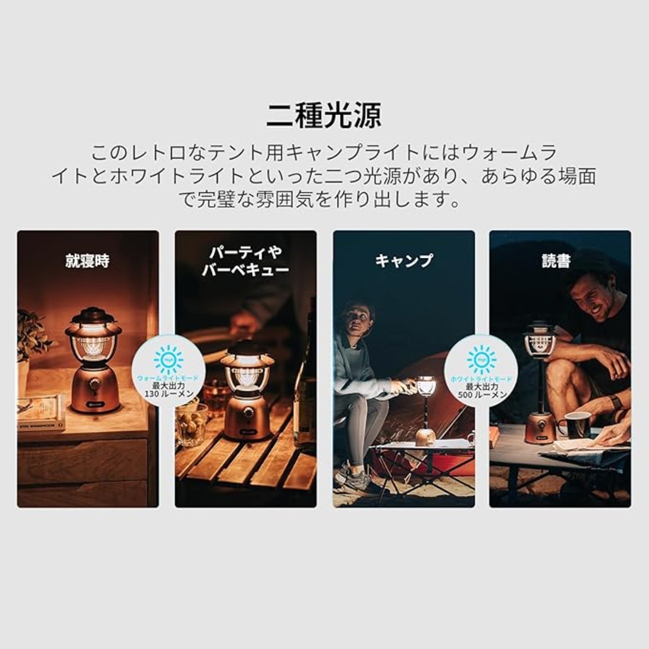 {伸縮設計&トグルスイッチ} 革新的な伸縮設計を採用したOlantern Stretchは、ベースと照明部分が伸縮ポールで接続されており、約183 5mmの伸縮が可能です。伸縮後の最大高さは406 5mmに達し、照明範囲はOlantern Classic 2 Proの2.3倍となっています。また、スイッチを左に切り替えればウォームライトモード(10~130ルーメン)に、右に切り替えればホワイトライトモード(130~500ルーメン)に切り替わります