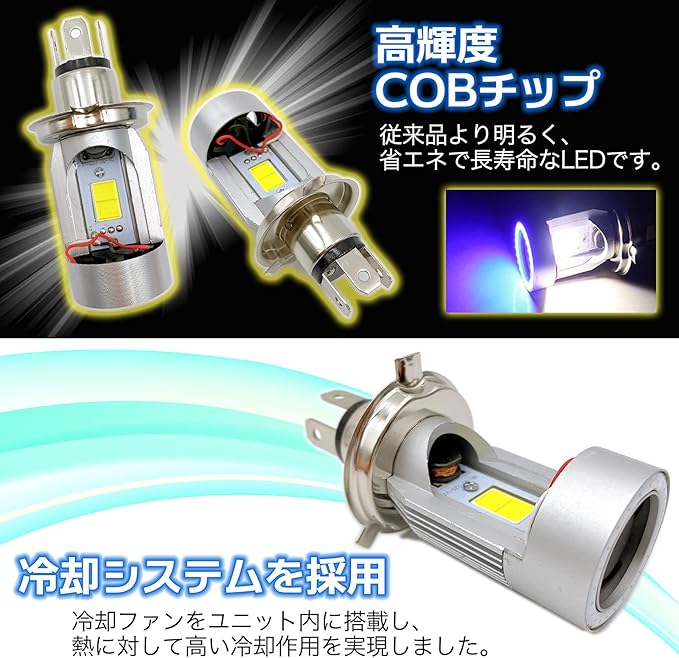 ハイロー(Hi/Low)切替可能なのでシーンに合わせてご利用可能です。 高輝度COBチップ搭載で明るさ抜群のヘッドライトバルブです。 さらに、LEDで高速冷却ファン搭載なので、省エネかつ長寿命な仕様になっています。