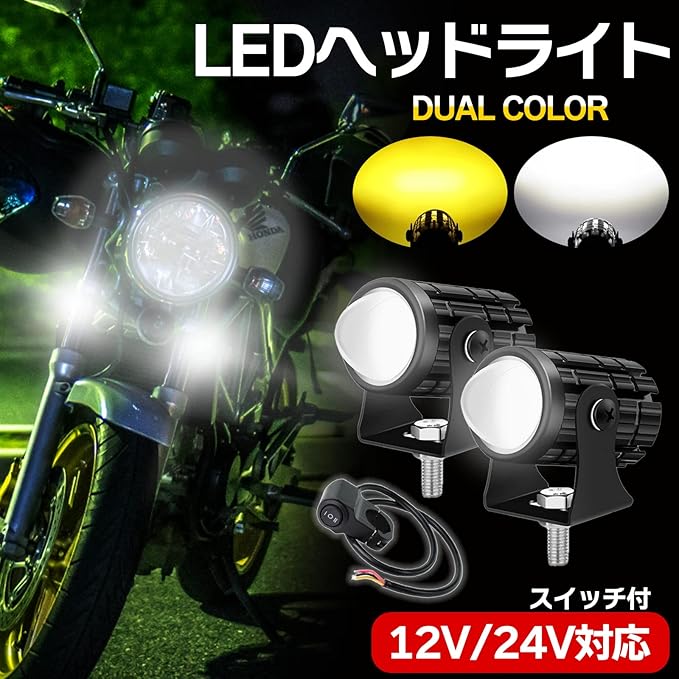12V、24Vどちらにも対応している高輝度LEDヘッドライトのミニプロジェクターです。 主にバイク用としてお使いいただけ、発光はホワイトとイエロー(アンバー)のデュアルカラーになります。