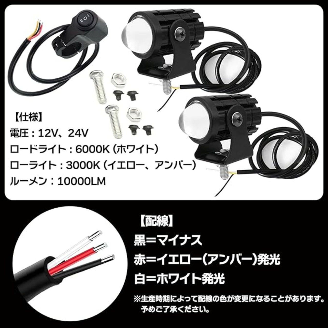 【仕様】 電圧 : 12V、24V / ロードライト : 6000K (ホワイト) / ローライト : 3000K (イエロー、アンバー) / ルーメン:10000LM / 配線 : 黒=マイナス、赤=イエロー(アンバー)発光、白=ホワイト発光 ※生産時期によって廃線の色が変更になることがありますので予めご了承ください。