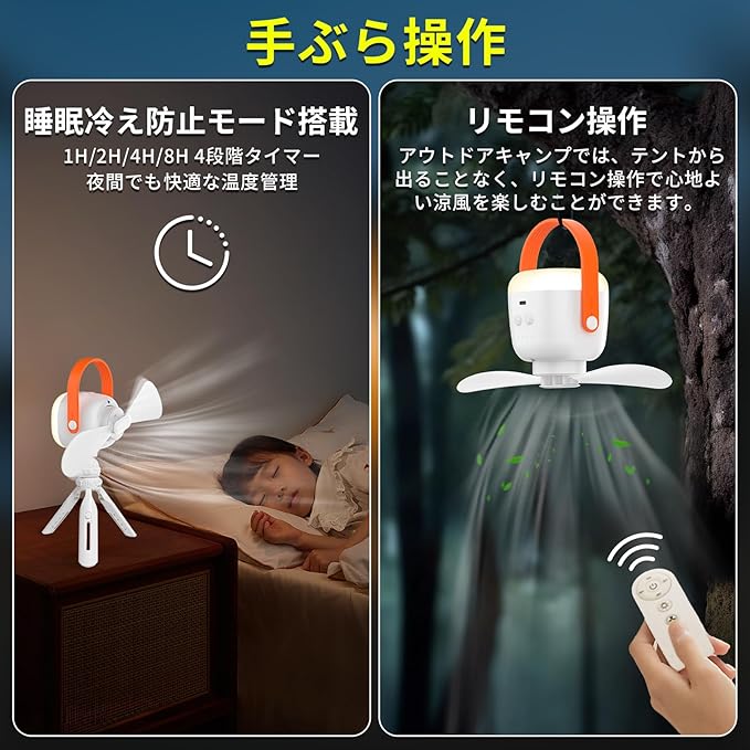 【超静音設計&リモコン操作|光と風のワンタッチ調整】 操作はすべてリモコンで可能。寝たままやテント内からでも、ライトのON/OFFや調光、ファンの風量切り替えが簡単に行えます。ファンはブラシレスモーターを採用し、就寝時でも気にならない約30dBの静音動作を実現。照明メインで使う場合も邪魔になりません。