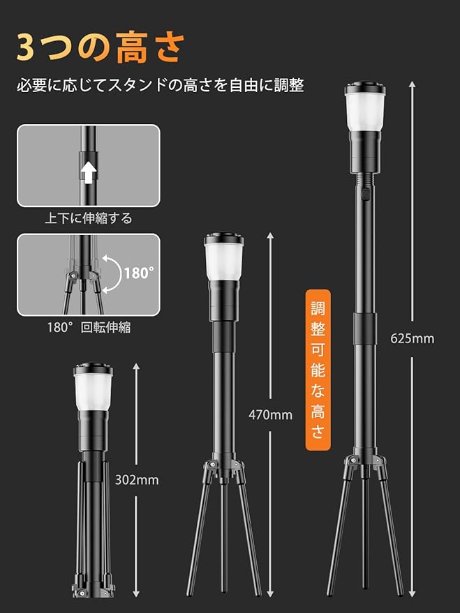 【伸縮式スタンド・頑丈な金属製三脚】スタンドの高さは302mmから625mmまで調整可能で、ニーズに応じてさまざまな照明範囲を柔軟に実現できます。三角形のスタンドとナットの設計により、落下の安定性を心配することなく、製品をテーブルやキャンプ地にスムーズに置けます。