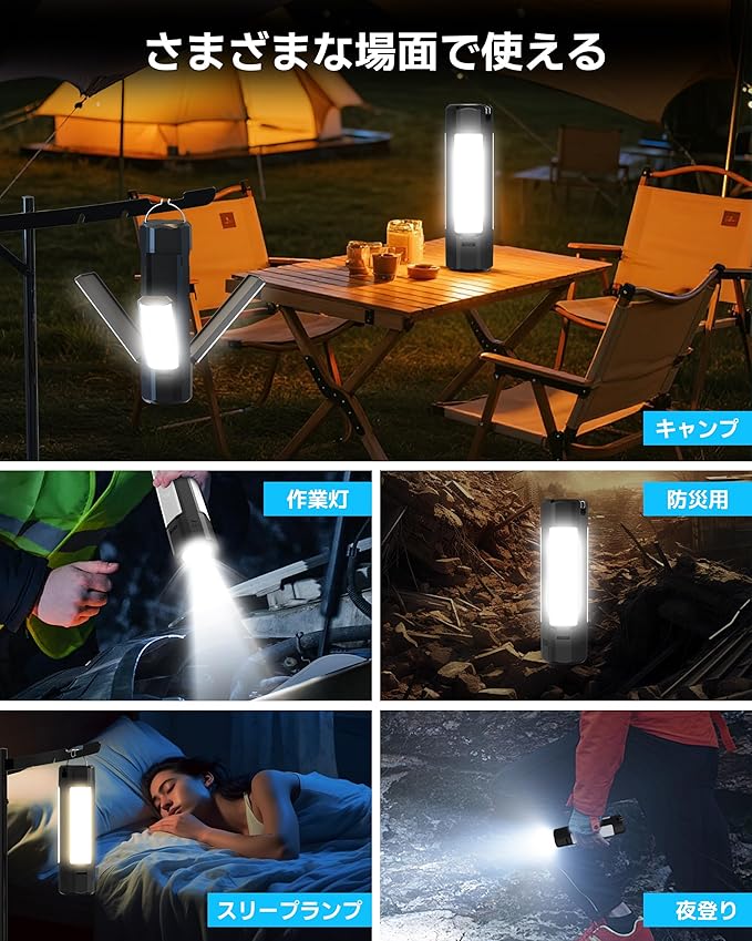 【さまざまな場面で使える】吊り下げ、手持ち、マグネット固定など、場面に応じた多様な設置方法が可能な 防災ランタンです。サイズは5.5*20.5CM,重さは約320gです。キャンプライト用途以外に、懐中電灯としても使用できるため、遠くまで照射し、復雑なアウトドア環境にも対応できる。緊急時にはSOSライトとしても使えるので、アウトドアでの活働にこのランタンがひとつあると安心な存在です!万が一停電の時、電池を備えてあれば長時間の連続照明が可能で、防災ランタンとしても重宝なアイテムです。