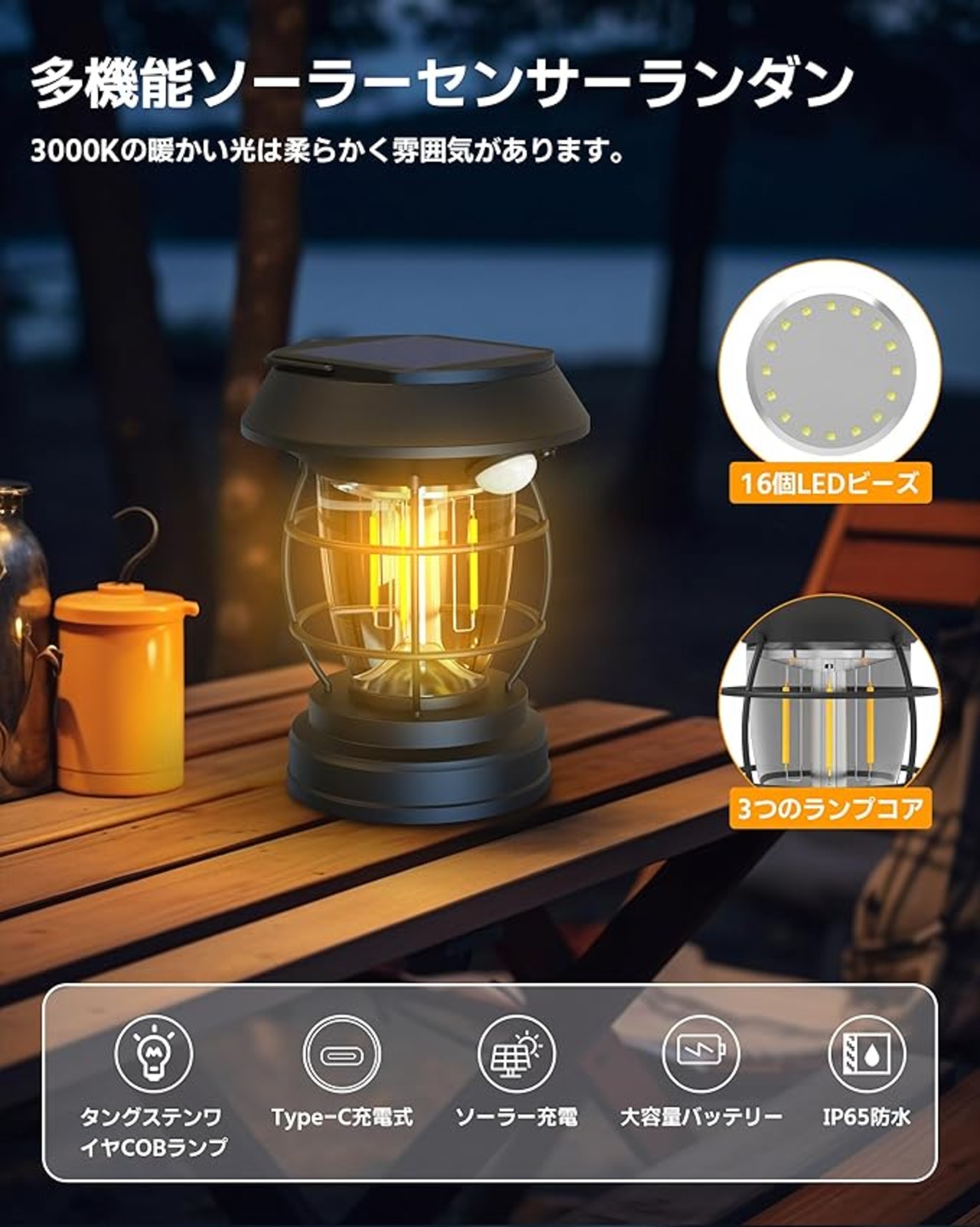 【防犯機能&IP65防水仕様】IP65防水防塵仕様のソーラーセンサーライトは、突然の雨や砂埃にも耐える耐久性。テント外周に設置すれば不審者や動物の接近を光で威嚇できるセキュリティライトとしても機能。キャンプはもちろん、庭先や災害時の非常用照明としても活躍します。