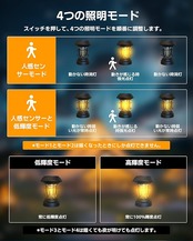 【4モード切り替えで多彩なシーンに対応】このLED ランタンはスマートセンサー技術を採用:1. 人感センサーモード(暗所で人を感知→自動点灯/20秒後に消灯)。2. 省エネモード(暗所で微光待機→人感知でフル点灯→30秒後自動復帰)。3. 常時点灯モード(50%明るさ)。4. 常時点灯モード(100%明るさ)。※防災ライトとして夜間のトイレ移動時や緊急時にも便利 。