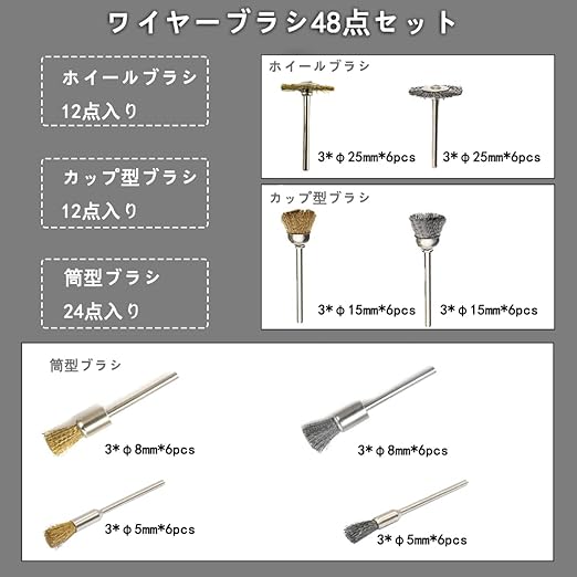 【セット内容】ワイヤーブラシ: ホイール型3*φ25mm*6pcs、カップ型3*φ15mm*6pcs、筒型3*φ5mm*6pcs、筒型3*φ8mm*6pcs; 銅ブラシ: ホイール型3*φ25mm*6pcs、カップ型3*φ15mm*6pcs、筒型3*φ5mm*6pcs、筒型3*φ8mm*6pcs合計48点入りセット、収納ボックス付
