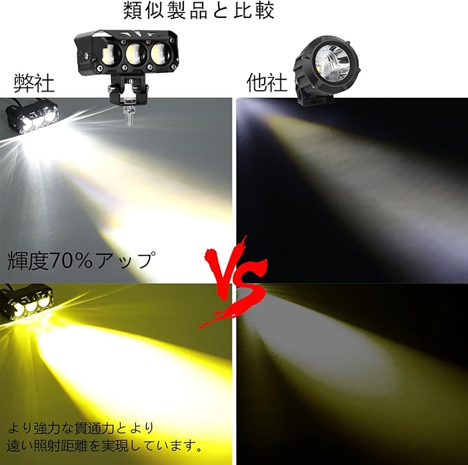 【2つの照明モード】バイク フォグランプは他のスポットライトとは違って、ほとんどのスポットライトは1色(白または黄色)しか投影できません。このLEDスポットライトは2色の間で自由に切り替えることができます。 フォグランプ ledは晴れた夜でも、雨や霧の日でも、完璧に機能を発揮することができます。