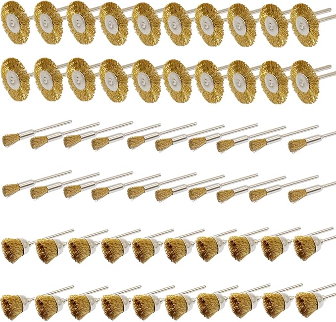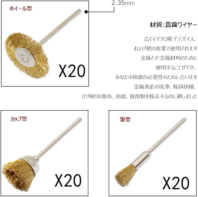 JINTONG リューター ブラシ 3種類真鍮ワイヤーブラシ ワイヤーホイールブラシ 研磨ブラシ 研削ブラシ 毛研磨ブラシ ボウルカップ形状 筆型 ドレメル 回転ツール アクセサリー 【2.35mm軸】 60個入り | KAZESHOP