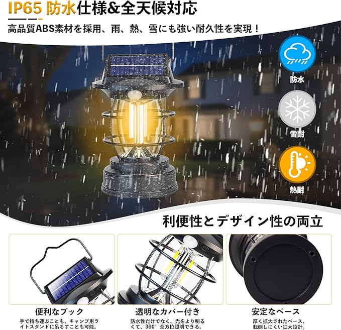 【高品質ABS材質採用・優れた防水性能】Gleazonキャンプランタンはシェルに高品質ABSプラスチックで作られるから、浸水、変形、破裂などの心配はいらないです。IP65の防水性能を持ち、雨の日、雪などの悪天候でも問題なく使用できます。ソーラーライトは動作温度は-20℃~60℃になり、四季でも楽に使えます。安心できる防犯ライトとして、常夜灯、キャンプライトやガーデンライトとしても利用でき、いつでもどこでも安心をサポート。