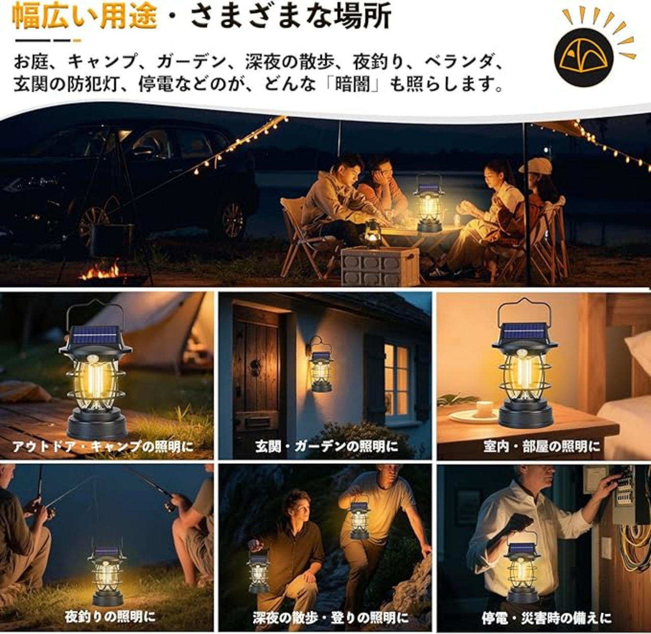 【1台多役・4WAY設置方式・簡単取付・幅広い用途】このソーラーライトは、壁に掛ける照明として使えるほか、卓上に置いたり、木の枝やテントに吊り下げたり、手に持って移動したりと、様々な使い方ができる多機能な照明です。壁掛け式を選べば、付属の壁掛けブラケットとネジセットで簡単に取り付けでき、女性でも楽に設置可能。配線不要ですぐに使え、手間もかからず便利です。テントや玄関周り、車庫の入り口などに設置すれば、不審な動きを光で威嚇するセキュリティライトとしてだけでなく、アウトドアのキャンプ照明や夜釣り、ガーデン、散歩や庭での使用、停電時の非常用照明としても重宝します。
