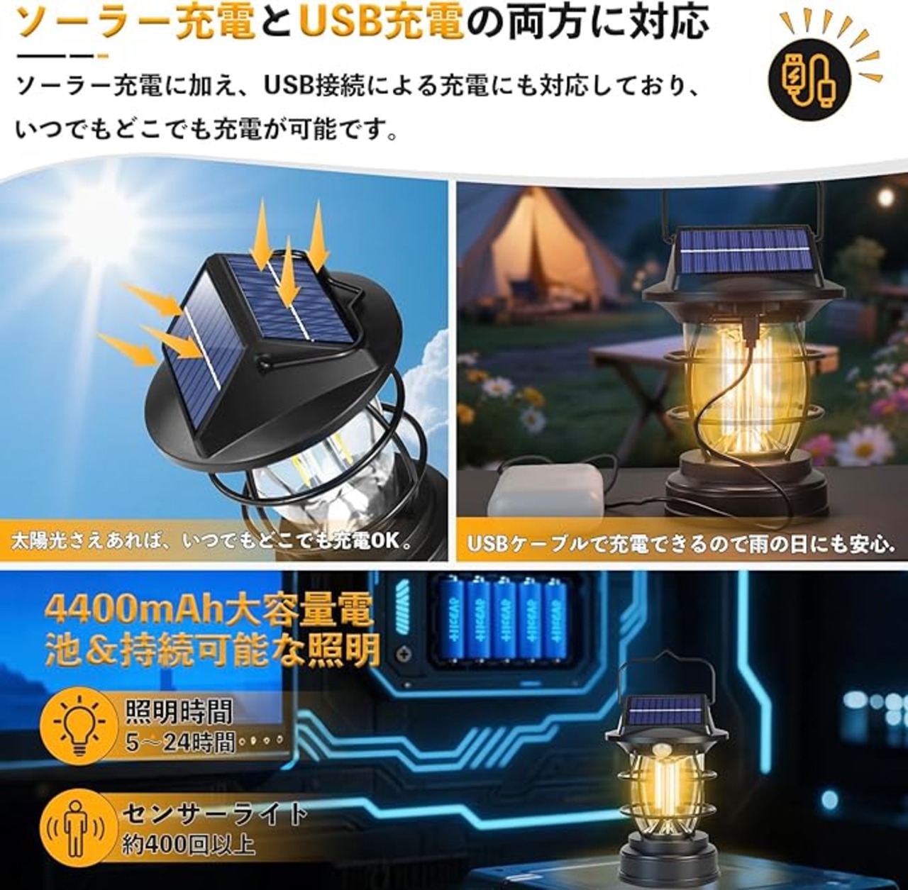 【ソーラー充電とUSB充電対応・4400mAh大容量バッテリー】ソーラー充電とUSB充電が使えるソーラーランタンです。①ledランタンには、2枚のソーラーパネルが搭載され、日当たりの良い場所に置いておくだけで自動充電が可能。電気代が不要で、省エネかつ環境に優しいです。②曇りや雨の日でも付属のUSBケーブルで簡単に急速充電できます。また、4400mAhの大容量バッテリーを内蔵し、1回の充電で400回以上の感知点灯又は最大5〜24時間が連続して照明可能で、頻繁な充電の手間を解消できます。