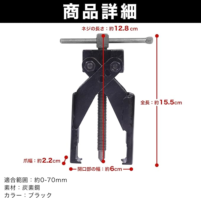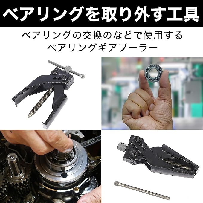 ベアリングを取り外す際に使用できる:ベアリング交換などでベアリングを取り外す際にご使用いただけるベアリングギアプーラーとなっております。ベアリングの適合範囲は、約0-70mmとなっております。