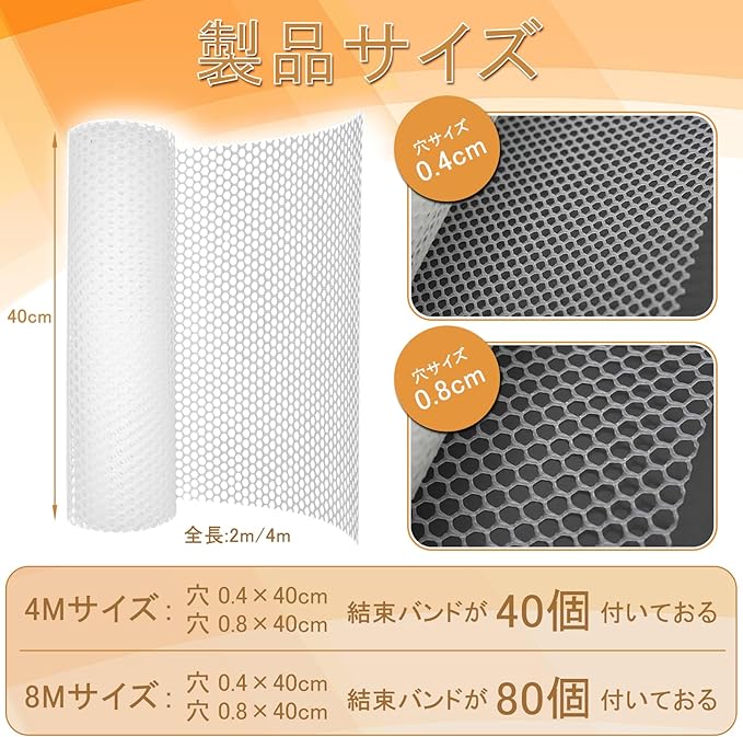 【豊富なサイズバリエーション】 0.4cm穴40cm 4m 0.4cm穴40cm 8m 0.8cm穴40cm 4m 0.8cm穴40cm 8m からお選び下さい。結束バンドが4mには40個、8mには80個付いております。お客様のニーズに合わせて、製品をお選びください。