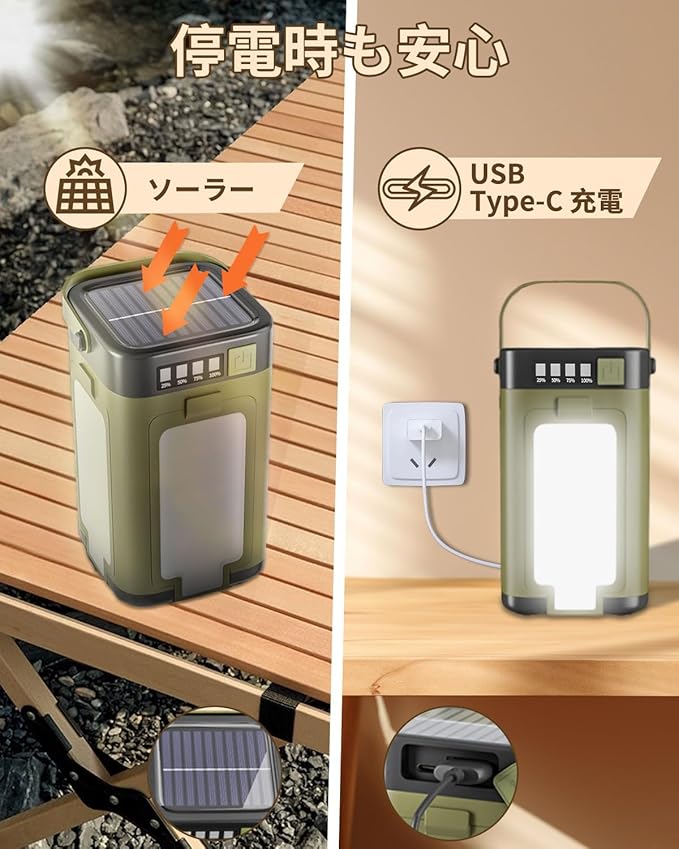 【ソーラー充電式 & USB Type-C】日中は太陽光で蓄電、夜はType-Cで素早く充電できる充電式ランタン。屋外でも室内でも使いやすく、停電対策や防災用途にも安心です。
