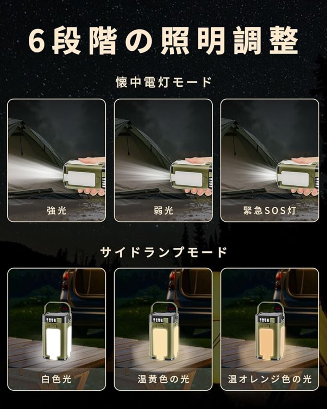 【6つの点灯モード・オレンジ色対応】懐中電灯(強・弱)、SOS、白色、電球色、焚き火色(オレンジ)を搭載。雰囲気づくりから手元作業まで、シーンに合わせて光色と明るさを調整可能。就寝前やキャンプの夜も目に優しく快適に照らします。